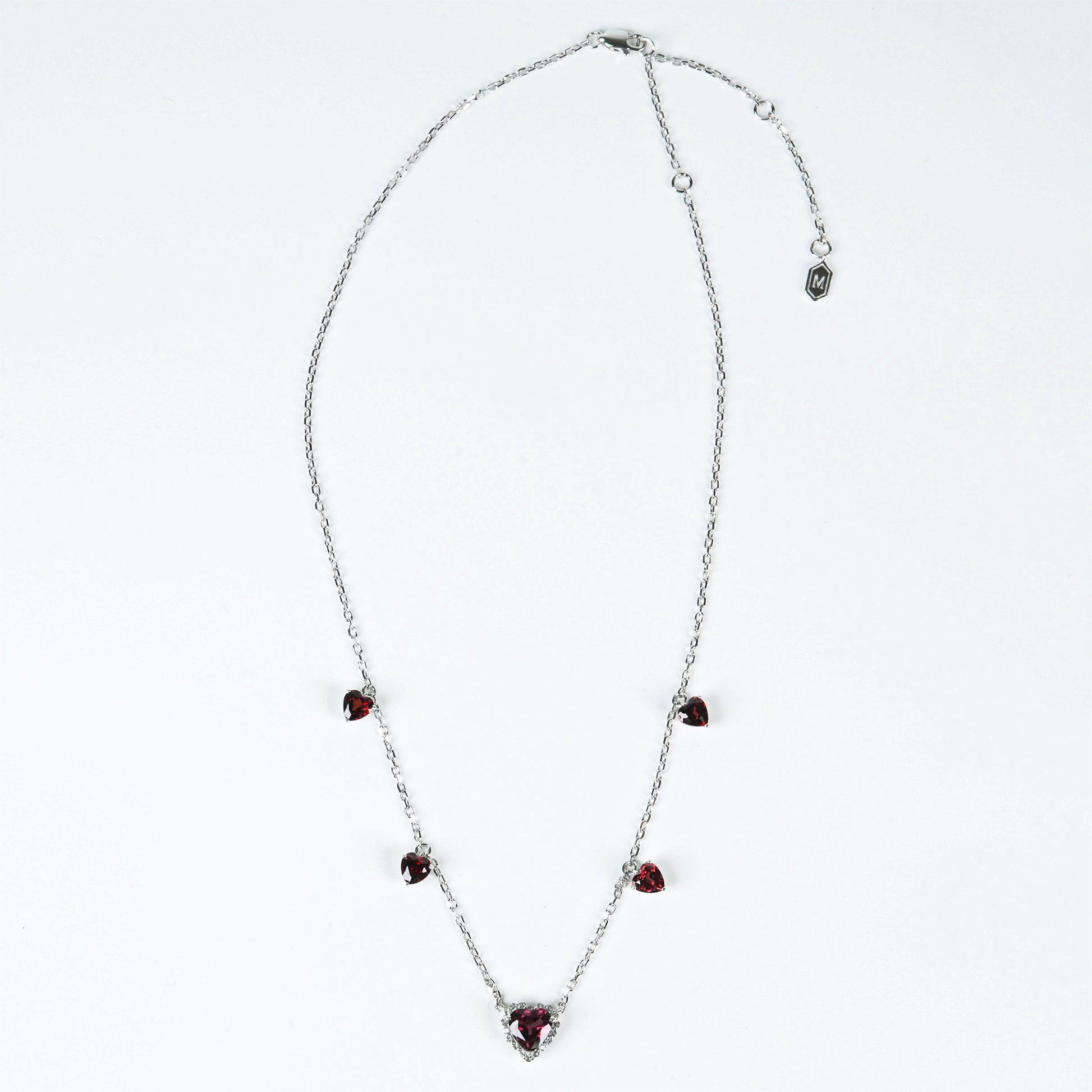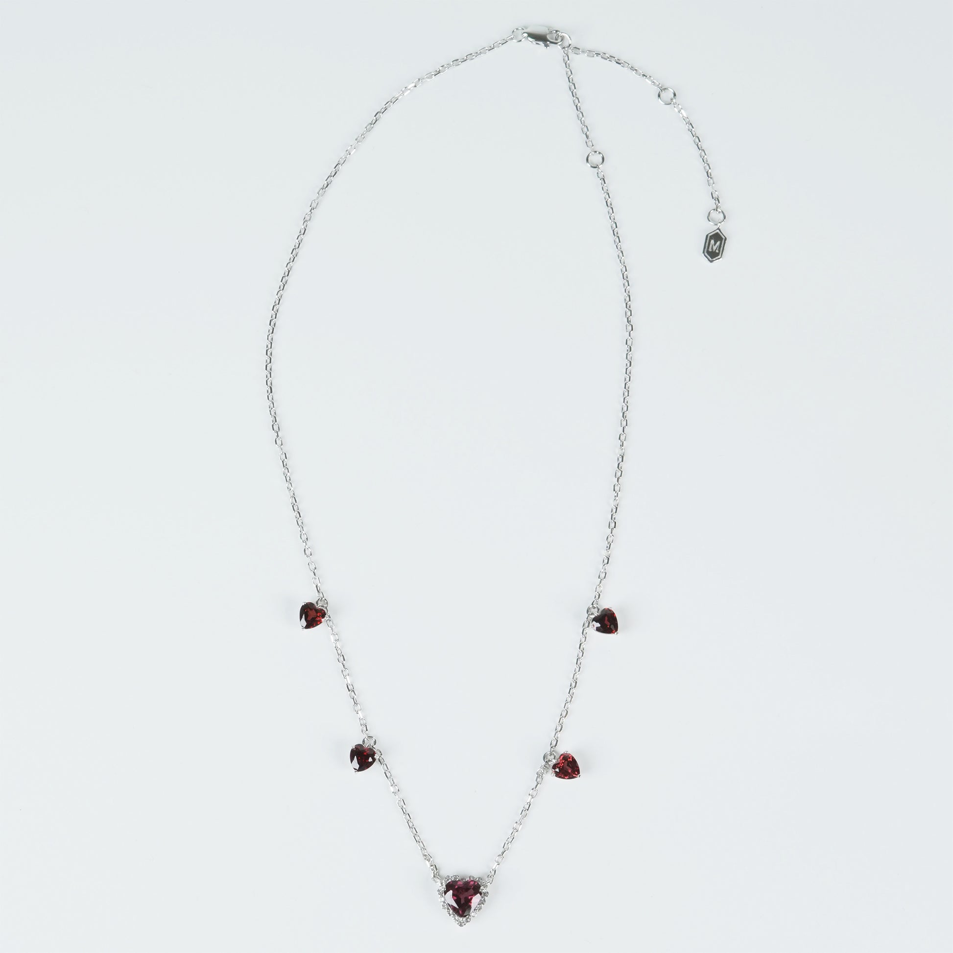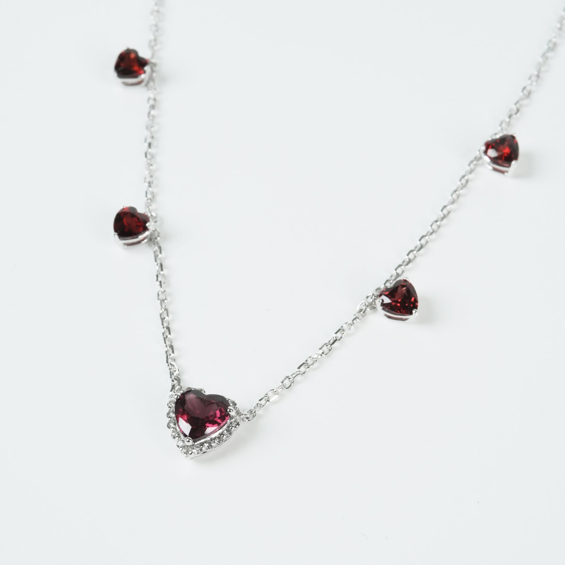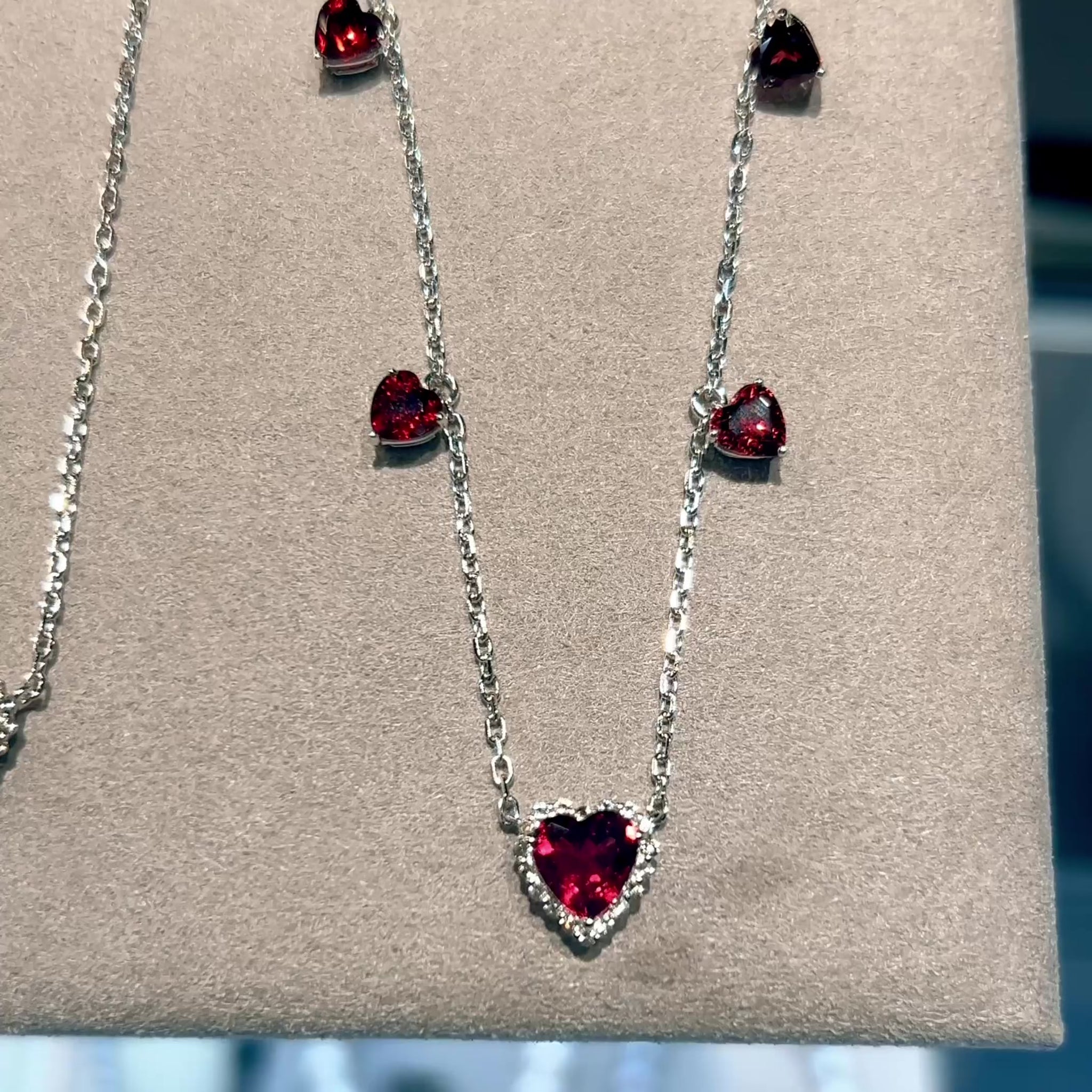 頸鏈主吊墜的主石周邊鑲嵌白色托帕石,更顯出主石心形切割的輪廓與石榴石飽滿的紅色。 此款項鍊除主吊墜外,還額外配有四個較小的心形石榴石吊墜,令頸鏈更富有層次感。紅石榴石令膚色更顯白。