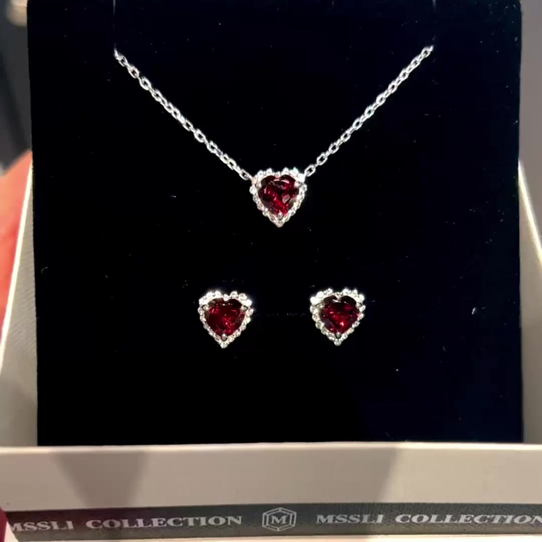 Dolly-Heart Collection挑選的石榴石是暗一點的紅色,裏面折射紅色艷麗色澤,散發着神秘感,再配上心形的切割,令人心動。主石周邊鑲嵌白色托帕石,更顯出主石心形切割的輪廓與石榴石飽滿的紅色。紅石榴石令膚色更顯白。